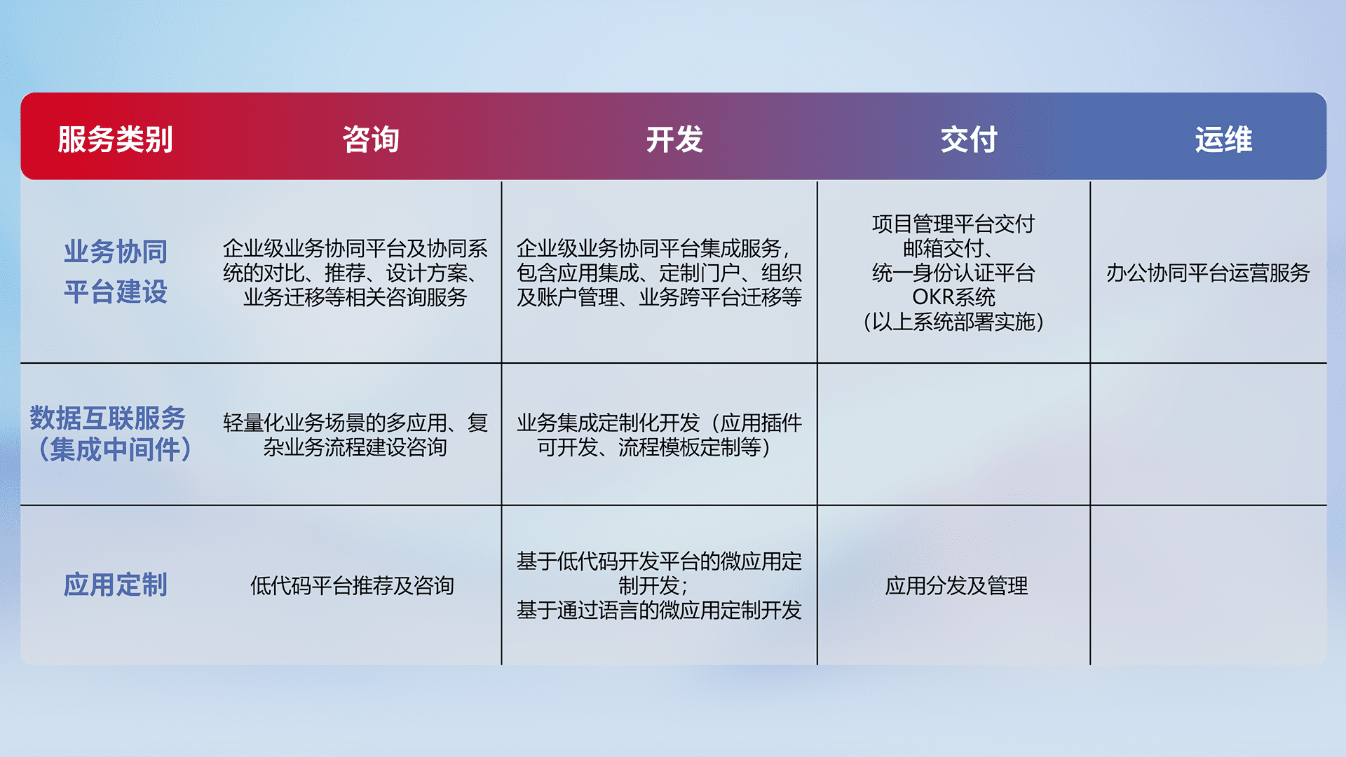 针对钉钉、、、企微、、、、IDaas等平台级产品提供产品的规划、、、方案、、交付、、、、定制化开发等服务,,实现如统一协同办公、、、智能客户服务、、、混合会议管理、、智能数据查询、、等业务场景,,,,实现数字化转型。。。