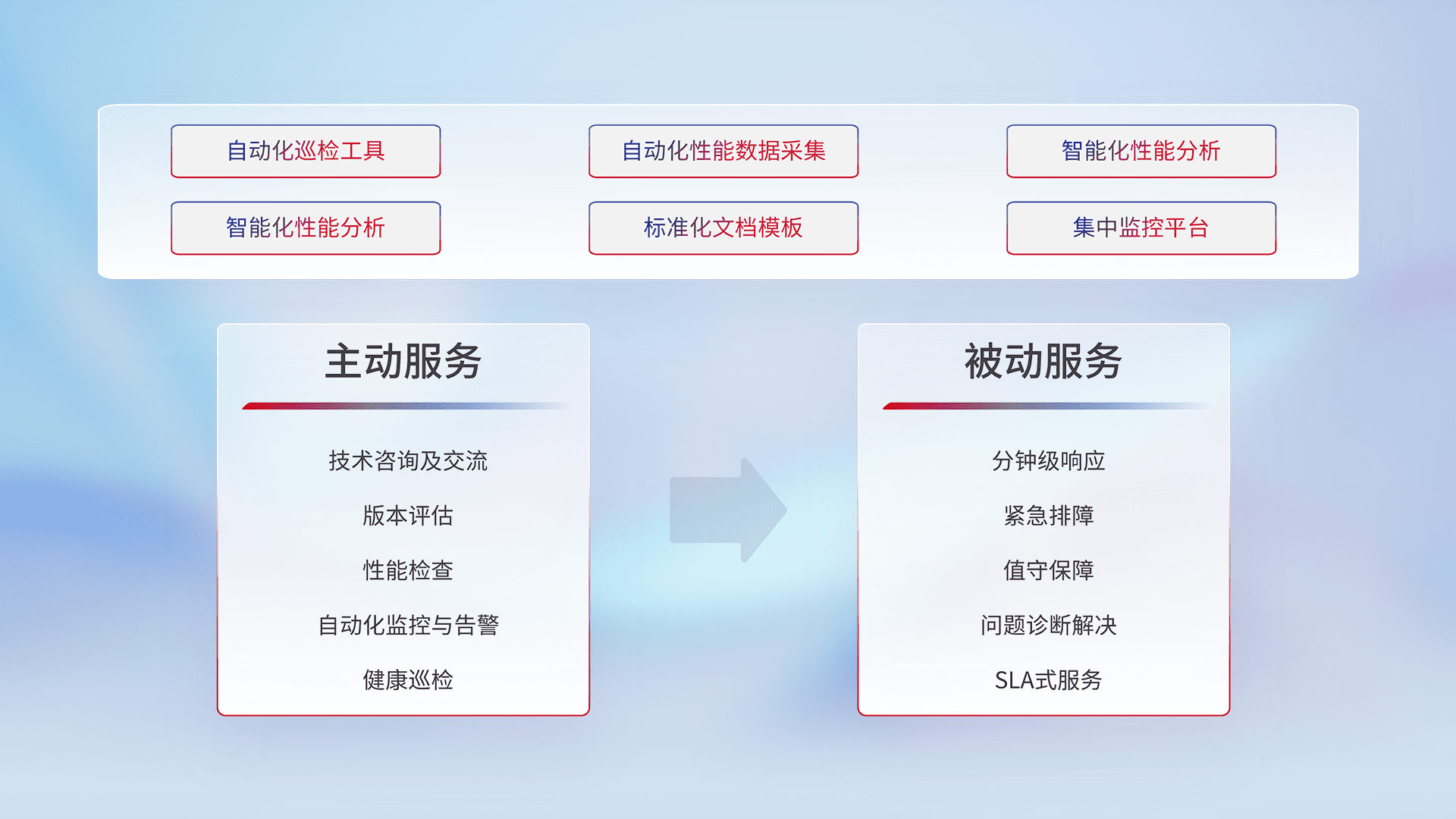 智能化工具和标准化文档,,保障服务质量,,,,提供主动服务(包含技术咨询、、版本评估、、性能检查、、自动化监控与告警、、、健康巡检)和被动服务包含(分钟级响应、、、、紧急排障、、值守保障、、问题诊断解决、、SLA服务)。。